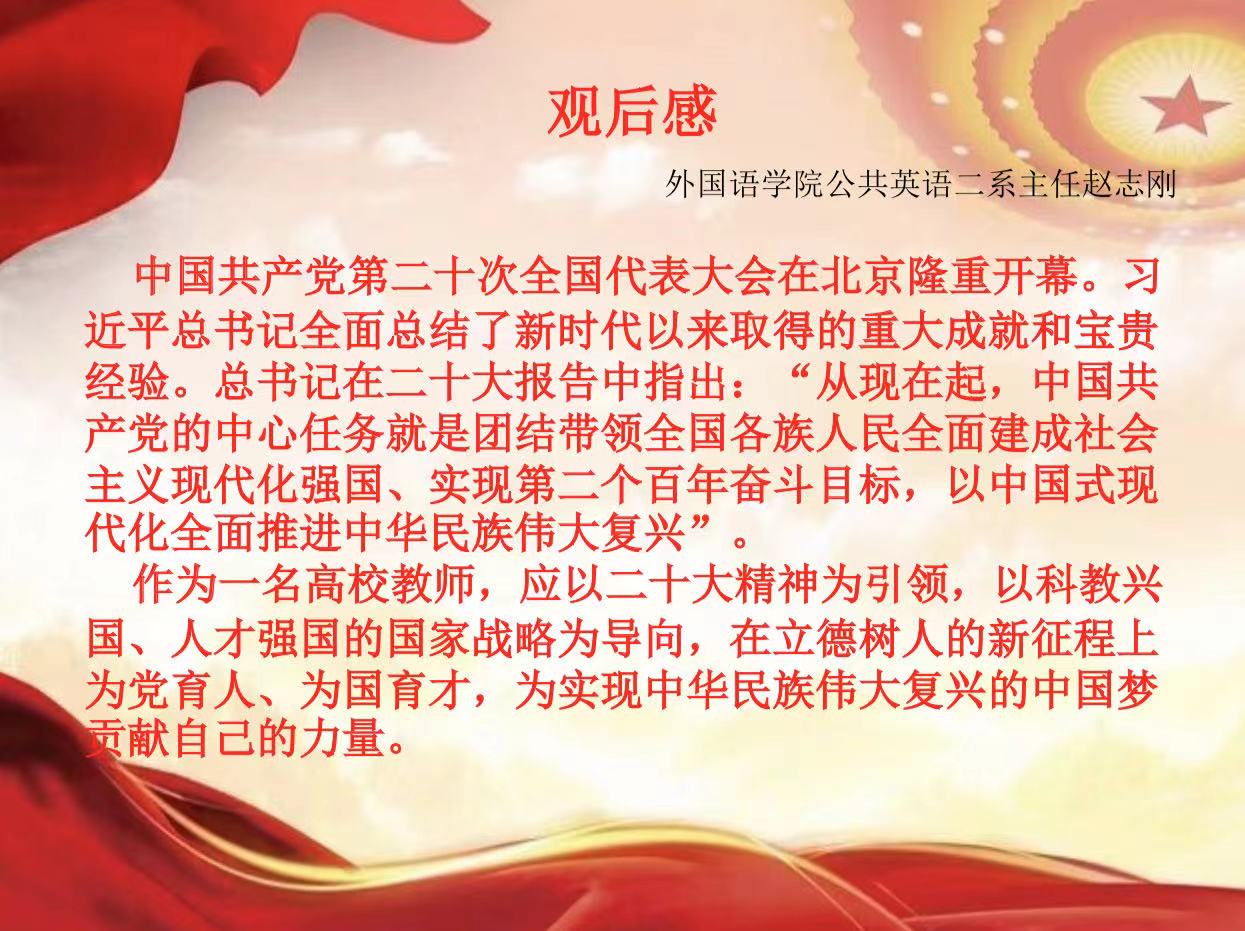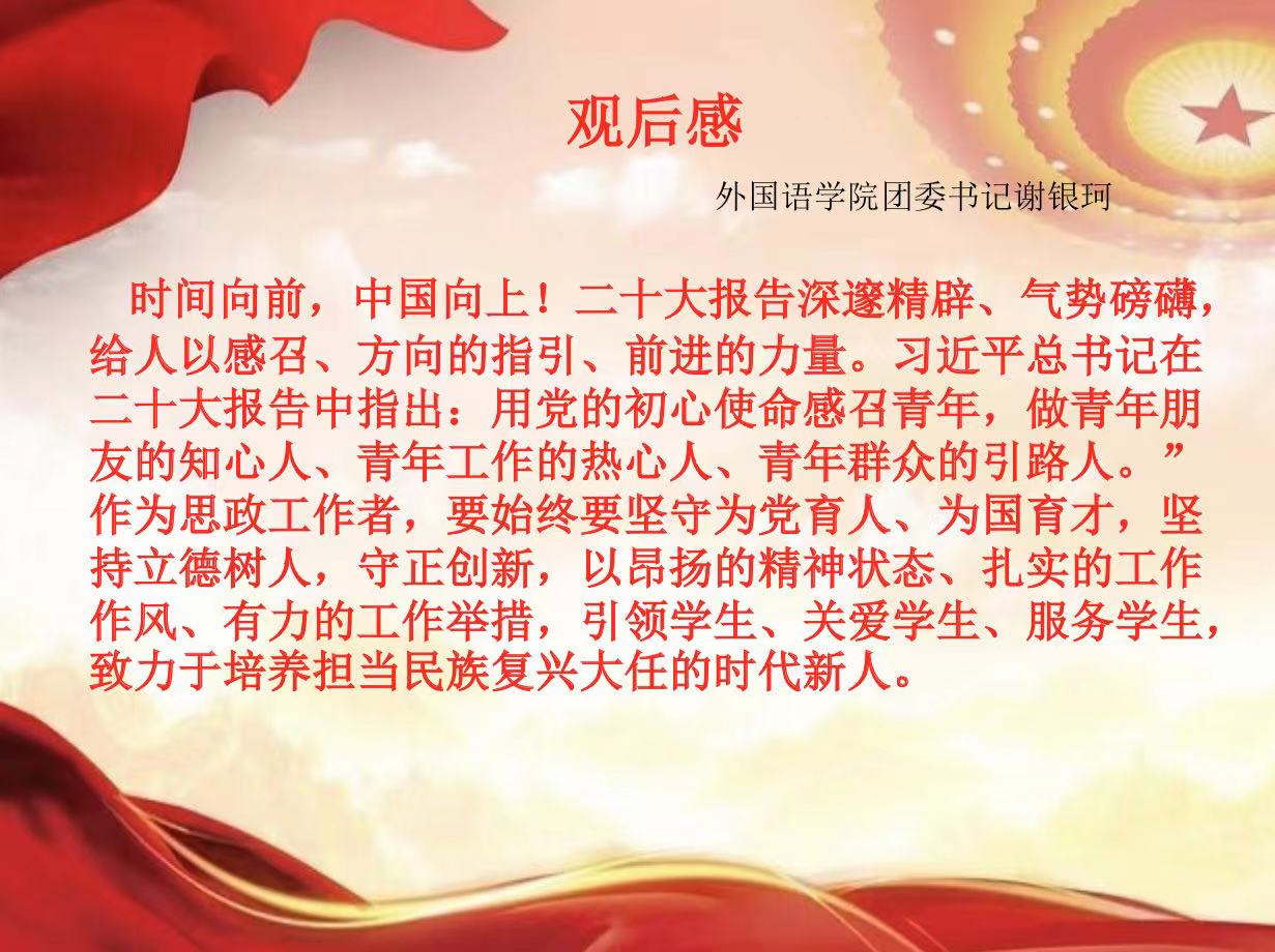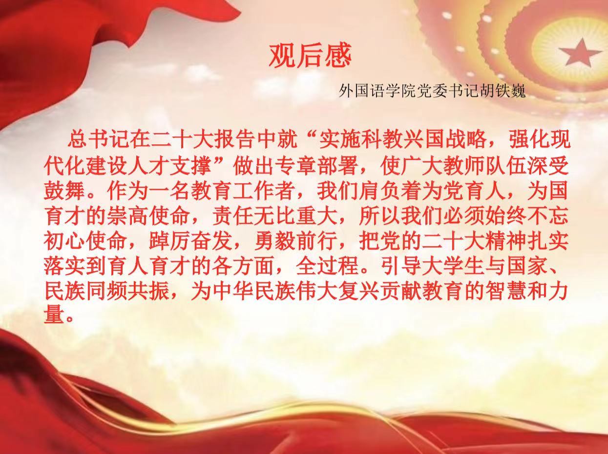 学院党委将以党的二十大精神为统领,紧密结合工作实际,把各项工作统筹好,推动好,奋力加压,再接再厉,确保圆满完成今年各项目标任务,以实际行动和优异成绩贯彻落实党的二十大精神。