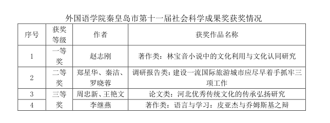 近日,秦皇岛市第十一届社会科学成果奖获奖成果名单公布,我校共有44项成果获奖。星空(中国)有4项成果获奖,其中一等奖1项(著作类),二等奖1项(调研报告类),三等奖2项(论文类1项,著作类1项)。