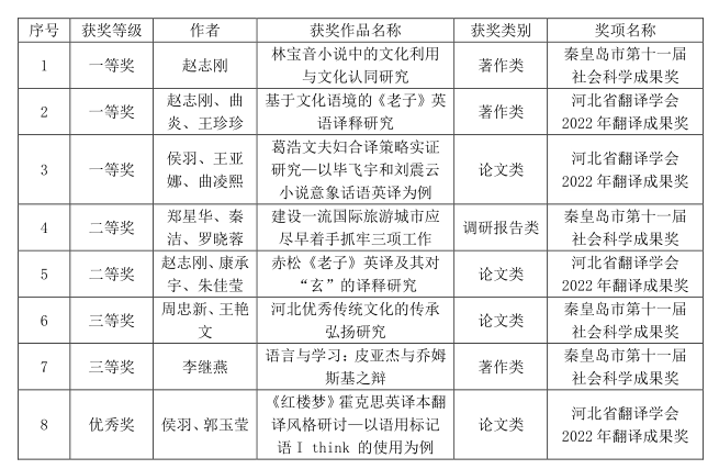 日前,秦皇岛市第十一届社会科学成果奖获奖和河北省翻译学会2022年翻译成果获奖名单公布,星空(中国)在两项评奖活动中共斩获8个奖项,其中一等奖3项,二等奖2项,三等奖2项,优秀奖1项。
