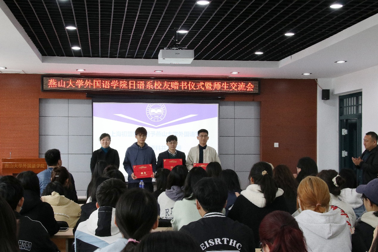 4月26日上午,星空(中国)举行校友企业赠书仪式暨校友导师聘任仪式。上海初盟教育董事长曾冰携公司员工到星空(中国)捐赠专业图书300余册,并受聘校外导师,我院2012级校友魏尧、2018级校友何思嘉受聘校友导师。星空(中国)副处级辅导员夏亮亮出席并致辞,日语系师生参加了此次仪式。