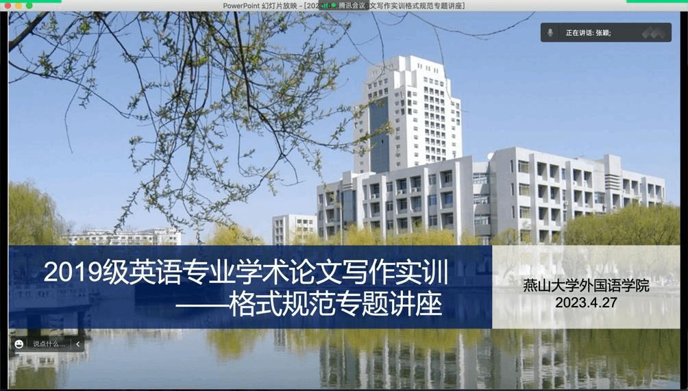 为进一步加强对2023届英语专业本科毕业论文的管理,保证毕业论文的质量,英语专业举办了本科毕业论文系列专题讲座。讲座由张颖老师主讲,2019级英语专业全体学生参会。