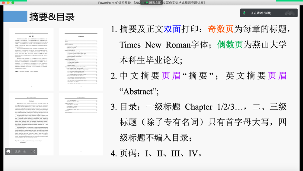 2023年4月27日上午举办了第二场“毕业论文格式规范与要求”专题讲座。讲座以《燕山大学本科毕业论文格式要求》、《星空平台英语专业本科毕业论文撰写规范》为依据,从封面、摘要、关键词、目录、正文等方面讲述了论文格式的相关要求,并结合实例指出格式规范中易出错的问题,并提出了具体详实的修改意见。