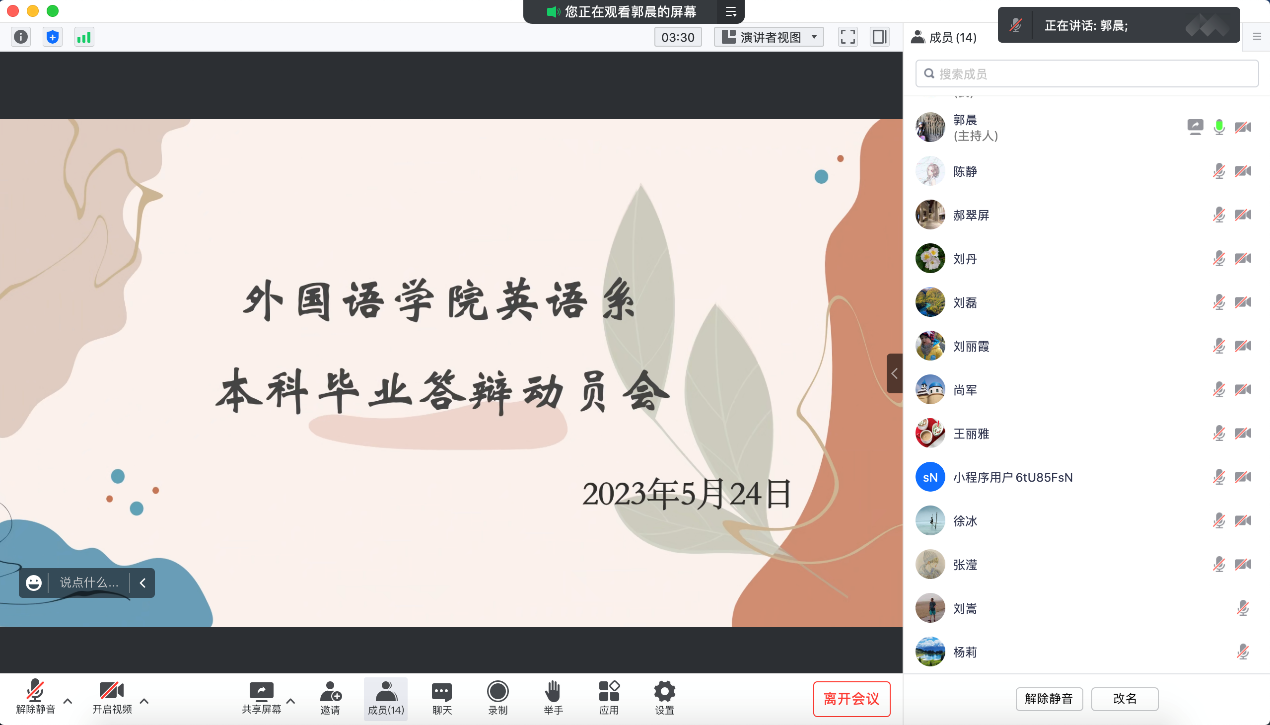 2023年5月24日晚,燕山大学英语系通过腾讯会议,组织全体教师线上召开了2019级本科毕业论文答辩动员会,旨在严格把控毕业生论文质量,确保答辩工作顺利进行。