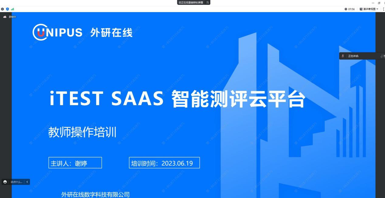 2023年6月19日下午15:00,星空(中国)委托外研社工作人员,在腾讯会议上为我院教师做了“iTESTt智能测评云平台”教师端的培训讲座,英语系以及大学英语系教师积极听取并参与了讨论。