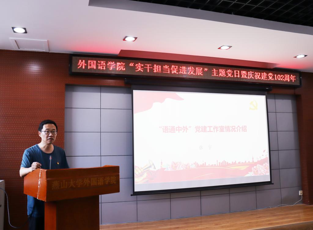 构建党建工作室,打造工作新阵地。为提升学院党建的生机和活力,加强新时期基层党建工作的科学性和实效性,为学院内涵式发展提供强有力的保障,学院5月份开始筹建“语通中外”工作室。活动中,党建工作室负责人张宇介绍了工作室基本情况,工作室的成员目前以英语系党支部党员为主,目标为“三个建设”旨在打造一个广阔的党建实践平台,使教师党员充分发挥党员引领作用,为全院师生成长和发展提供沃土和可供参考的机制。