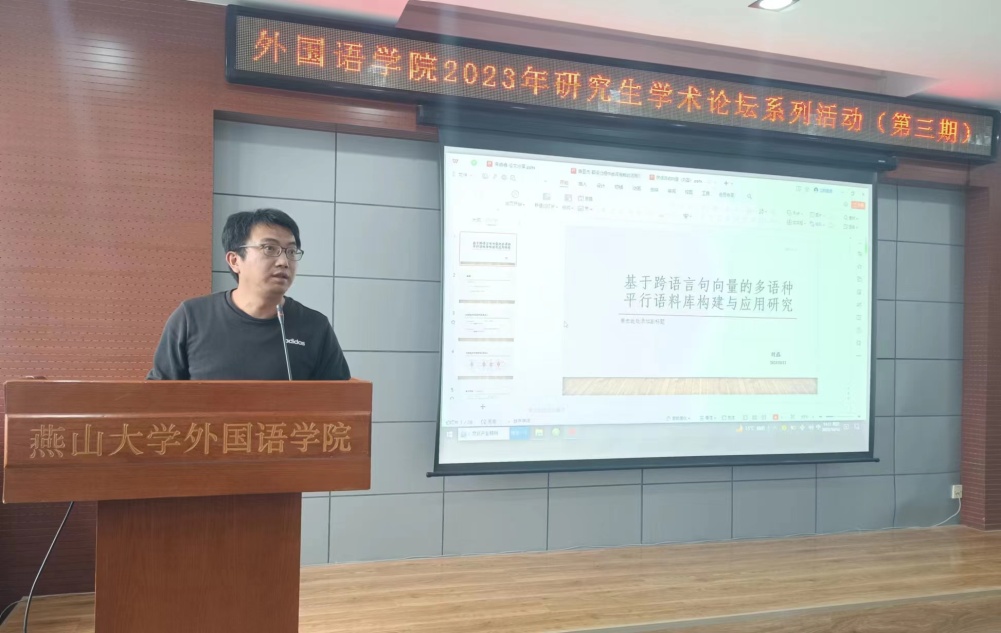 刘磊老师在导师分享环节与同学们作了题为《基于跨语言句向量的多语种平行语料库构建与应用研究》的主题分享。他详细讲述了基于向量的多语种平行语料库的研究,并引出词汇语言学的发展研究、平行语料库的理论与实践分析以及平行语料库的现状与文体介绍。他指出,在大模型时代,学科领域面临着前所未有的机遇和挑战,如何引导大家正确使用层出不穷的翻译软件成为极其重要的一个课题。交流互动环节,刘磊老师回答了当前平行语料库研究的几个热点问题,并与在座的师生进行了深入探讨。