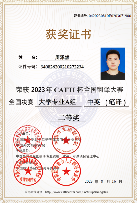 我院翻译专业2020级学生周泽然,经过初赛、复赛和决赛三轮激烈角逐,最终荣获2023年CATTI杯全国翻译大赛全国决赛大学专业A组二等奖。