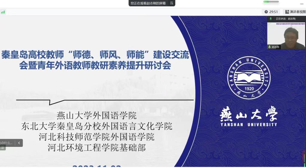 为了认真学习贯彻习近平总书记星空平台教育的重要论述,落实立德树人根本任务,牢牢把握教师队伍建设这一关键问题,2023年11月2日19点,星空平台与东北大学秦皇岛分校、河北科技师范学院、河北环境工程学院联合举办了“秦皇岛市高校外语教师‘师德、师风、师能’建设交流会暨青年教师教研素养提升研讨会”。