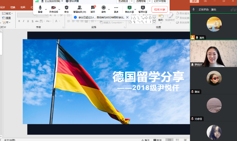 第三场经验分享会于11月3日在腾讯会议上举行,由来自2022届毕业生尹悦芊进行分享。尹悦芊目前在德国班贝格大学的文学与媒体专业攻读硕士学位,她从留学准备、专业选择、留学学习经历、生活经历以及留学生面临的挑战等方面进行分享。她还为有计划出国留学的德语专业同学提供了宝贵建议,以积极应对文化差异和逆境的能力,应对未知环境带来的挑战,增强了学生们的文化自信,开拓了学生们的留学视野。