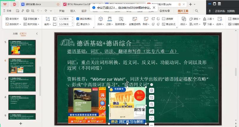 第一场经验分享会于10月30日在腾讯会议上举行。现任天津汽车模具有限公司商务经理的2022届毕业生王文杰,分享了包括商务报价、项目投标以及客户维护等方面的就业经验,以及如何在工作过程中不断学习专业技能和语言技能的经验,并强调了做好职业规划和行业分析对就业的重要性。此外,他还鼓励德语专业学生注重德语专业知识以及英语的学习,为做好职业发展规划打下坚实基础。