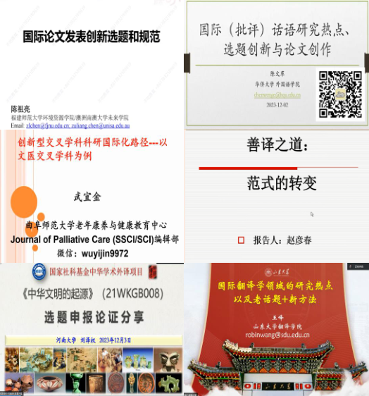 本次研讨会为期2天,安排了6场高水平学术讲座。来自福建师范大学的陈祖亮教授、华侨大学的陈文革教授、曲阜师范大学的武宜金副教授、上海大学的赵彦春教授和河南大学的刘泽权教授分别作了科研国际化方法路径、国际学术论文发表、中华学术外译项目申报、译学热点、学科交叉融合国际化路径等主题讲座,主讲嘉宾与参会师友进行了深入的探讨和交流,分享了各自的经验和发现,展示了他们的研究成果和创新思维。会议安排了互动答疑板块,使研讨更具有针对性和成效性。