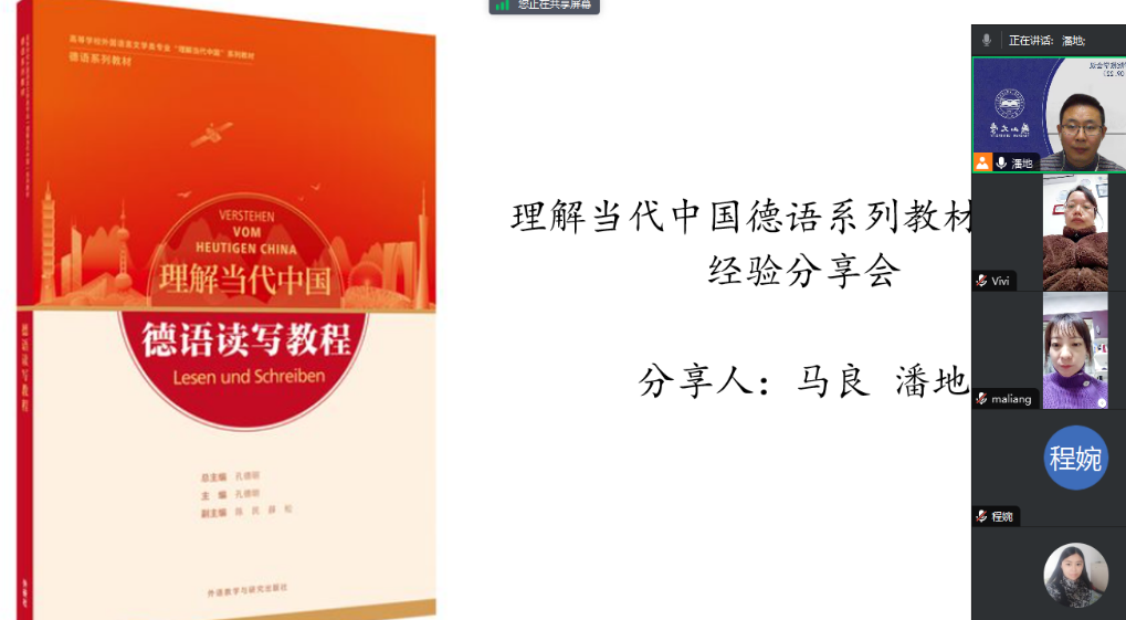 12月18日晚,德语专业通过腾讯会议举办了以《理解当代中国》系列教材为主题的教学经验分享会。本次分享会由德语专业负责人潘地主持,德语专业全体教师参加了本次会议。马良老师和潘地老师分别分享了《理解当代中国德语演讲教程》在高级口译课程以及《理解当代中国德语读写教程》在高级德语III课程中的成功应用经验。