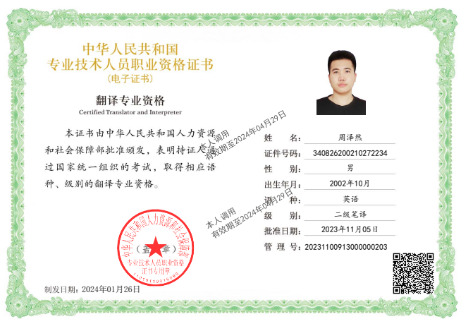 周泽然同学获得证书,既展现了我院学子的翻译知识和实践水平,也彰显了翻译专业相关阅读、笔译理论教学和实践教学的质量和效果,为专业教学质量进一步提升和学生笔译能力进一步提高起到了一定的示范和引领作用。