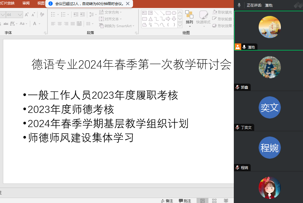 会议伊始,潘地老师组织了2023年一般工作人员年度履职考核、2023年师德考核相关工作,并进一步优化了年度考核和师德考核专业内部考核标准。之后,潘地老师组织德语专业全体教师对2024年春季学期基层教学组织开展讨论。老师们积极献言献策,主动申报开展新学年教学研讨主题,青年教师们积极参与听课活动,集体制定了本学期的公开课和教学资源建设课程。最后,全体德语专业教师一起观看了“第八届高校青年教师(九场九项)全能必修教学基本功养成及能力提升专题培训”的师德师风篇并展开讨论,进一步加强了专业内部师德师风建设。