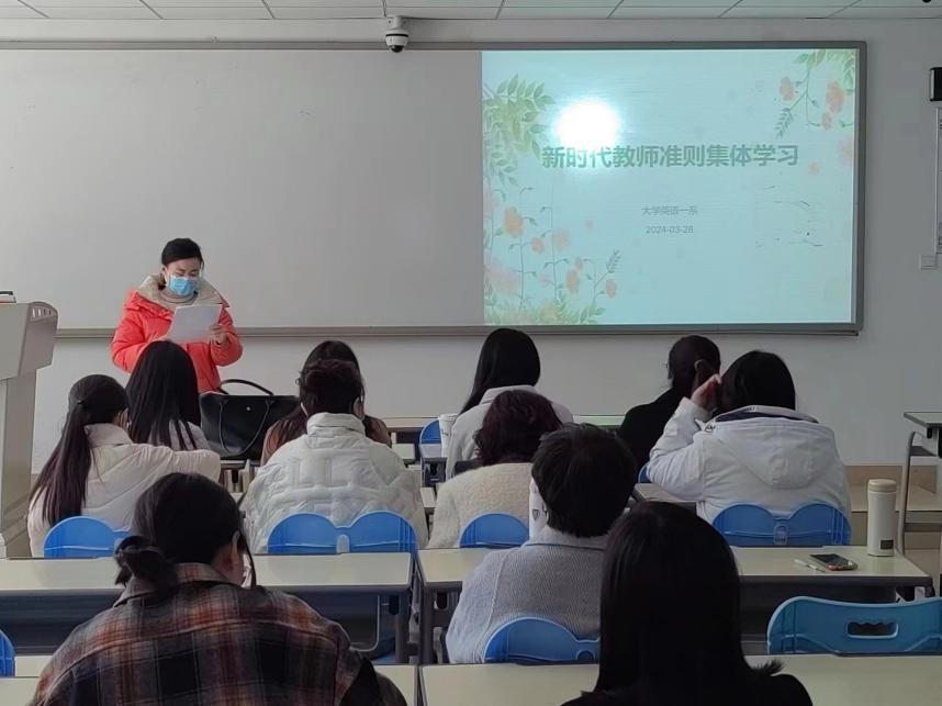 为深入贯彻落实党的教育方针,加强高校教师队伍建设,提升教师职业道德水平,进一步加强师德师风建设,3月28日下午,大学英语一系全体教师在四教110开展《新时代高校教师职业行为十项准则》集中学习,本次学习由系主任杜俊杰主持。