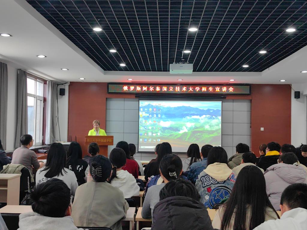 2024年4月2日下午3时,俄罗斯阿尔泰国立技术大学国际教育与合作处负责人娜塔莉娅·巴丽什尼科娃访问我院并做招生宣讲。学院主管国际交流与合作的副院长付继林、国际合作处工作人员、俄语专业师生参加了宣讲会。宣讲会由俄语专业负责人崔岩主持。