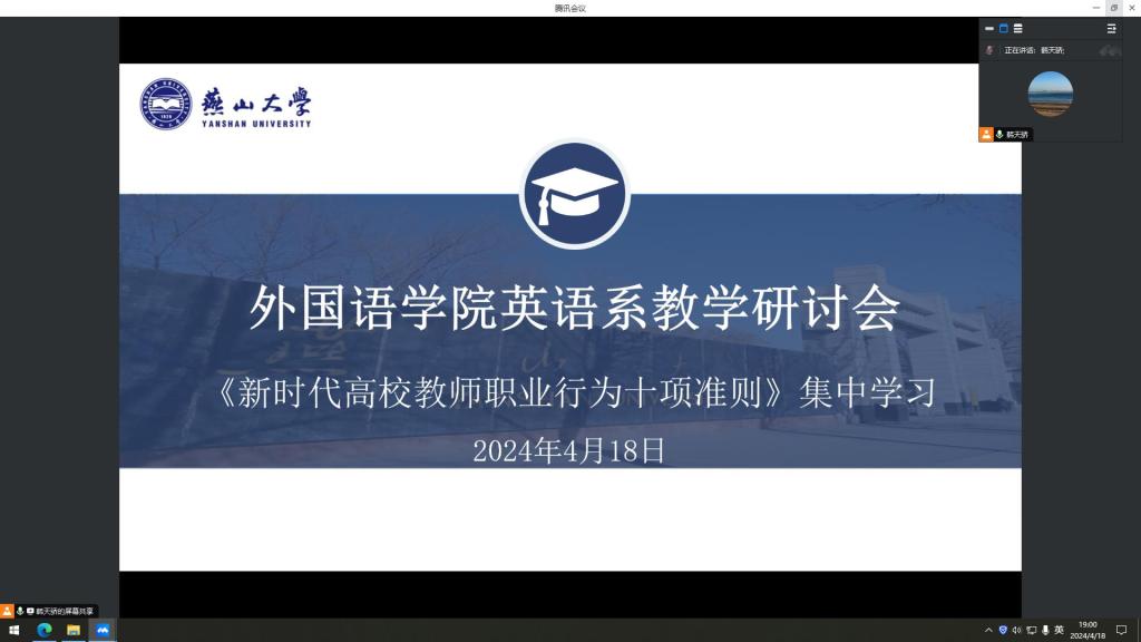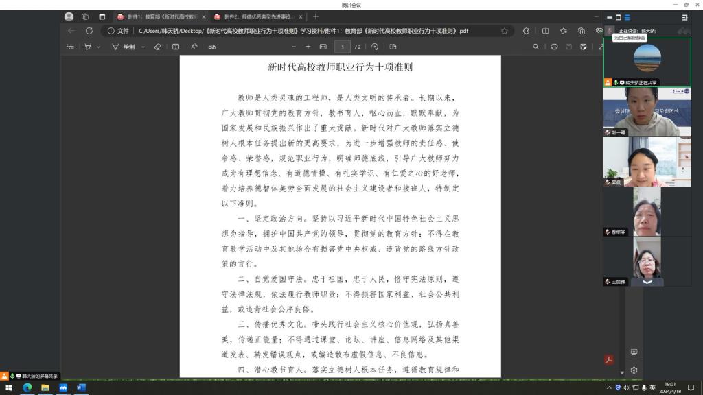 为进一步规范高校教师的职业行为,英语专业教师于2024年4月18日晚7点在线上集中学习教育部星空平台《新时代高校教师职业行为十项准则》的相关内容。