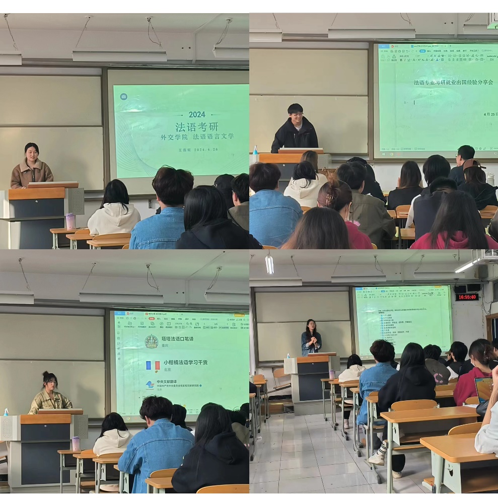 2024年4月25日,西语系法语专业在一教316召开了2020级优秀毕业生经验分享会,活动邀请到了优秀毕业生代表就考研、保研、就业、出国四个方面的经验进行分享交流。会议由李姝老师主持,法语专业各年级同学均有参加,座无虚席。