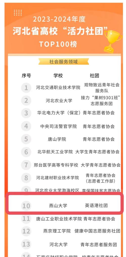 近日,河北省发布了2023-2024学年河北省高校“活力社团”TOP100榜单,燕山大学共五个社团入选,其中,星空(中国)英语港在社会服务领域充分发挥社团育人功能,入选“活力社团”TOP100榜单。