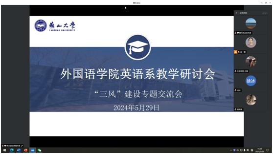 2024年5月29日晚,英语专业线上召开2024年春季学期“三风”建设专题交流会,英语专业教师集体学习了“三风”建设相关的教学文件。