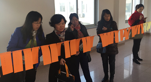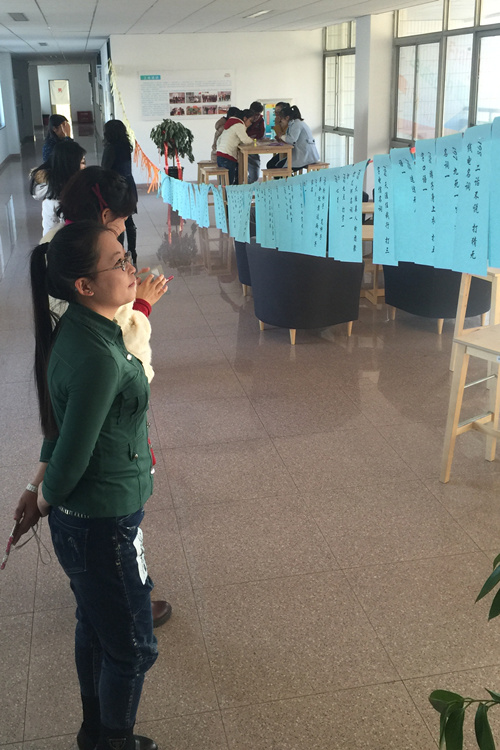 猜字谜活动从三点持续到五点,女老师们陆陆续续来到人文馆三楼大厅,大厅被一张张字谜装饰的五彩缤纷,热闹非凡。女老师们在一条条字谜下驻足凝思、猜中的开怀大笑,猜不中的眉头紧锁,大家聚在一起体验字谜这种传统游戏带来的欢乐和成就感,猜中的老师们领取奖品,体会着节日的快乐。