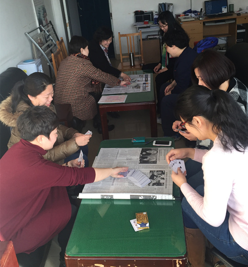 在人文馆303职工小家中,三组扑克选手展开了拉锯战。有的小组在斗地主,有的小组在玩拖拉机,有的小组在玩升级,这些平时在教学一线的女教师们,玩起扑克来也显露出了各自的聪明才智。