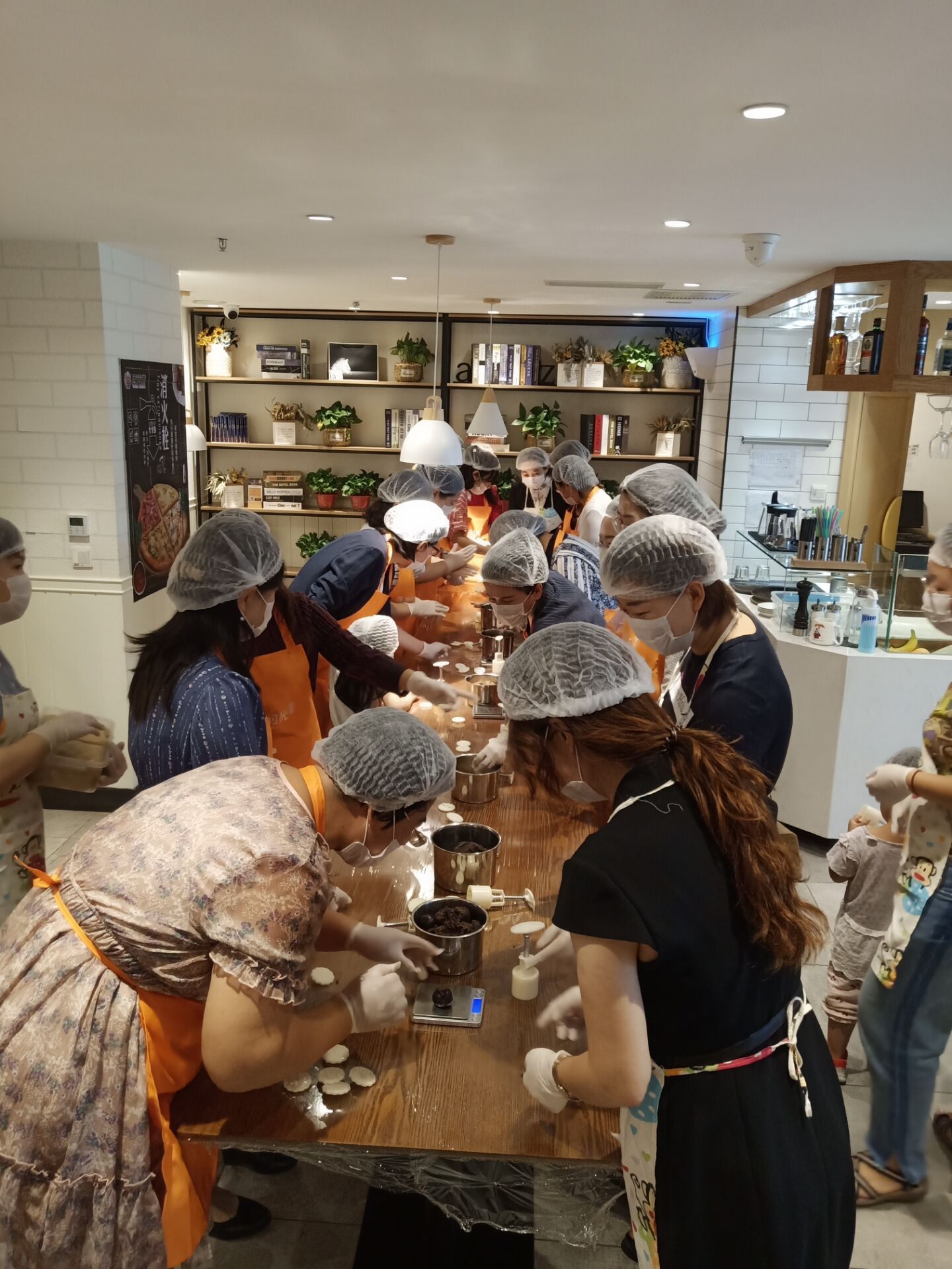 晓阳微熏,店内已是一片欢乐的海洋,热情洋溢的教师们正翘首以待。9点时分,活动正式开始。统一着装的大家有模有样地围拢在长桌四周,俨然成竹在胸的糕点师,个个雀跃不已。满屋都是月饼馅儿的馨香,阵阵袭来,沁人心扉,在店里人员的指导下,几十个“面点师”同时上阵制作月饼,场面壮观、热烈、温馨,他们一边畅所欲言,一边团结互助,亲如一家。“巧出饼师心,貌得婵娟月”,人人都使出浑身解数,忙得不亦乐乎,饱含着浓浓的团圆情的月饼很快就摆成了“长龙”.......,虽然有的月饼的模样不尽如人意,但却是自己亲手制作,自是让人格外钟爱,每个人的脸上都乐开了花儿。上午11点,活动结束。教师们依然意犹未尽,纷纷拍照留念,笑容灿烂。