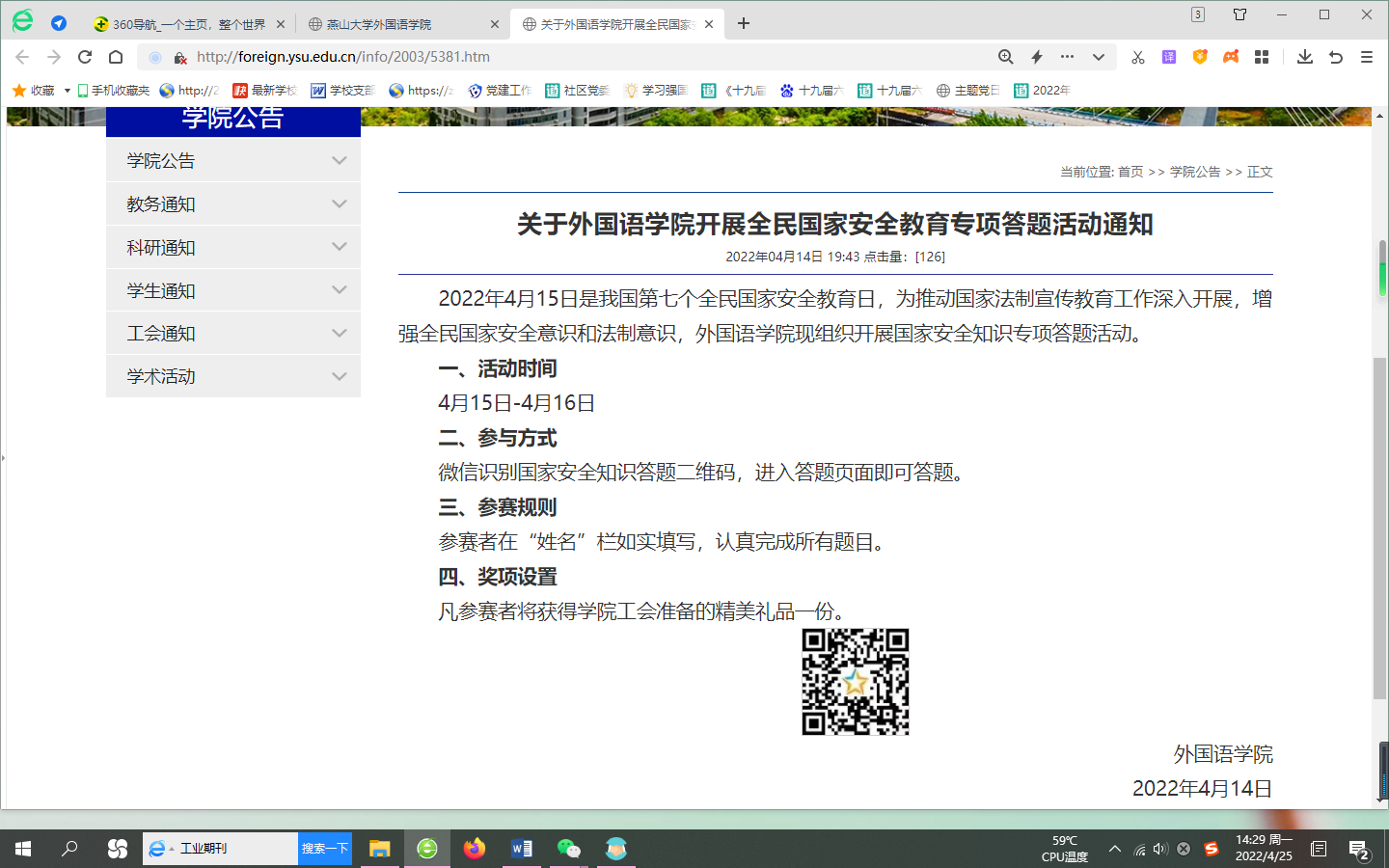 2022年4月15日是我国第七个全民国家安全教育日,为推动国家法制宣传教育工作深入开展,增强全民国家安全意识和法制意识,4月15日——16日,星空(中国)工会组织开展了国家安全知识线上答题活动,40余名教工参与了答题。