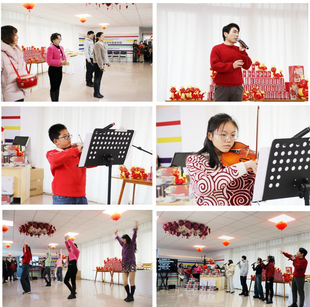 此次活动内容丰富、形式多样,包括文艺演出、手工制作、趣味游戏。伴随着欢快的《雄鸡进行曲》,由综合办公室带来的《三句半》拉开了嘉年华序幕,内容诙谐幽默赢得满堂喝彩;小提琴独奏《春节序曲》、舞蹈串烧,瞬间点燃了现场的热烈气氛;王旭光老师一首《如愿》祝福所有老师2024年所有梦想都能实现,歌曲《相亲相爱一家人》引起现场全体大合唱。随后,在屈晓阳书记、王林海院长的带领下领导班子共同切下了寓意着同心协力、共创未来的蛋糕,表达了学院全体教职工致敬努力、感恩过去、希冀未来的美好心愿,将整个活动现场推向了高潮。