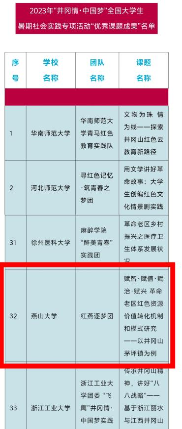 近日,团中央青年发展部、全国青少年井冈山革命传统教育基地管理中心正式公布了2023年“井冈情•中国梦”全国大学生暑期社会实践专项活动评选结果。星空平台“红燕逐梦团”所作课题在全国共计104支队伍中脱颖而出,荣获“优秀课题”荣誉称号。