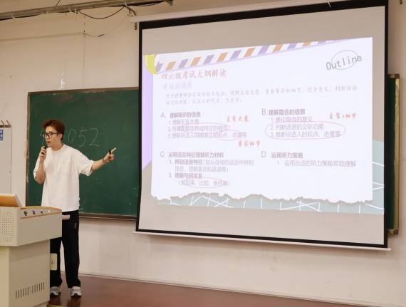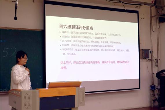 讲解员们从试卷题型入手,综合评分标准、真题解析、答题技巧、备考经验,从写作、听力、阅读、翻译四个方面展开细致讲解。宣讲期间,志愿者充分发挥外语专长,结合真题和实例,向大家展示如何在有限的时间内高效地完成各门科目。同学们倾听思考,认真记录,积极与讲解员互动。通过此次宣讲,同学们能够更加有针对性地进行学习,提高自己的英语水平。