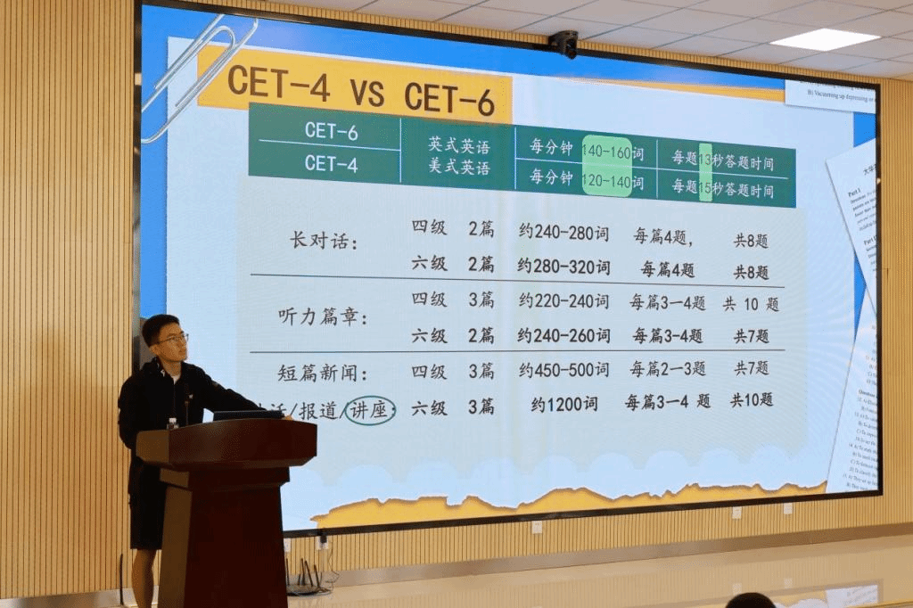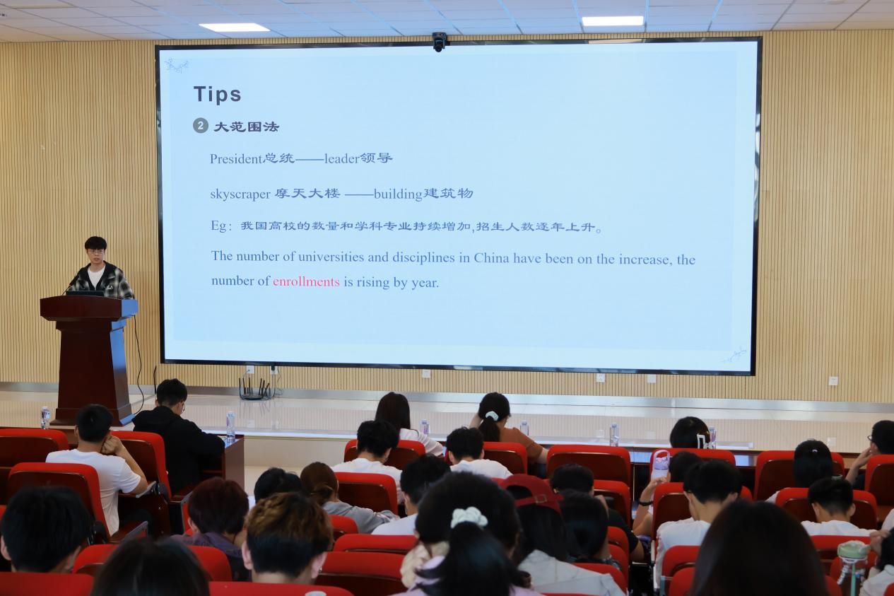 四位金牌讲解员从写作、听力、阅读、翻译四个方面出发,分析了大学英语四六级考试的题型差异、建议答题顺序以及重点备考方向。依据历年真题,讲解员们梳理出了考试的重难点并给出了答题技巧、答题策略以及备考经验。最后,讲解员们还整理了一些学习资料合集供同学们参考。通过使用这些辅助材料,同学们能够更加有目的性地进行学习,提高自身英语水平。宣讲期间,信息科学与工程学院(软件学院)的同学们认真倾听,认真记录,现场学习氛围十分浓厚。
