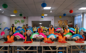 志愿者与老人一同表演扇子舞