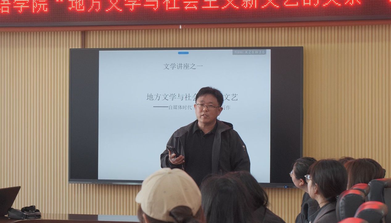 讲座围绕地方文学的发展与当代文艺语境展开。刘剑老师结合自身创作实践与研究体会,从地方文化书写、现实题材表达及文学与时代关系等角度进行了系统分享,引导在场师生从更广阔的视野理解文学创作的价值与意义。讲述内容深入浅出,既有理论梳理,也有经验交流,具有较强的启发性。