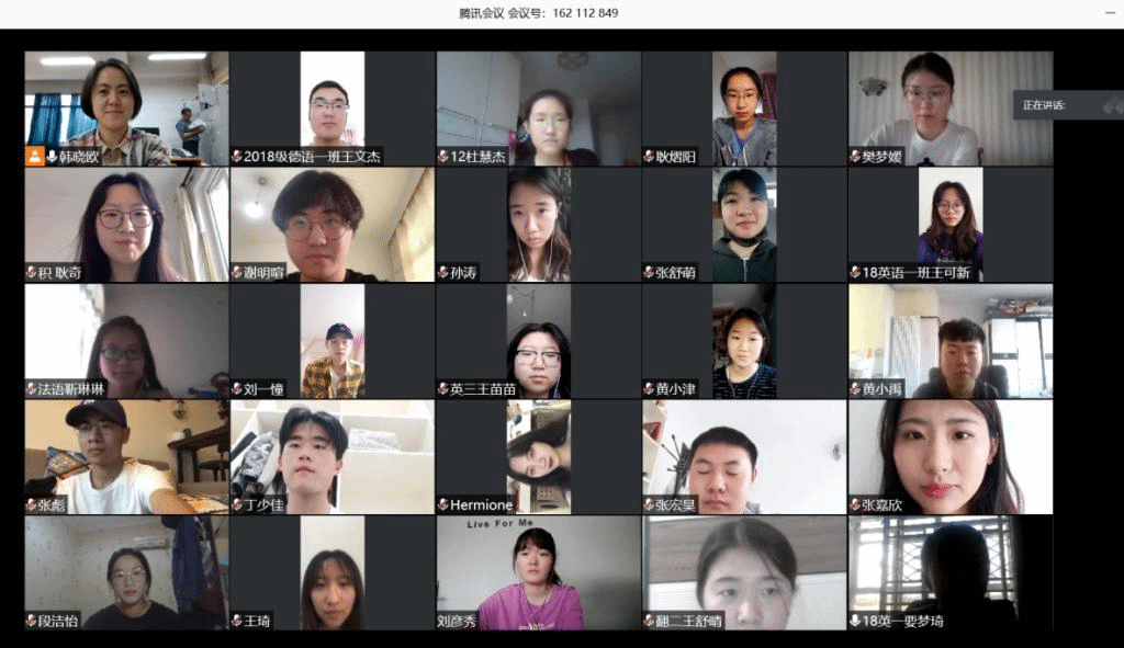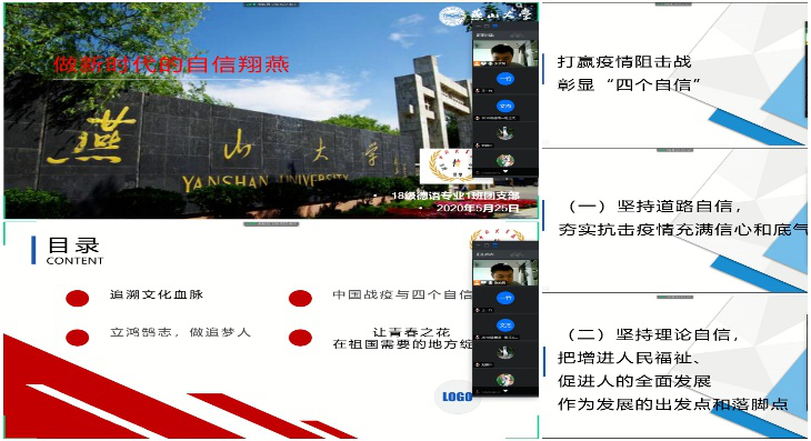 为弘扬爱国主义精神,激发大学生的爱国热情,树立民族自豪感,坚定制度优势自信,星空(中国)各年级共计依托QQ、腾讯会议、钉钉等线上形式开展爱国主义主题班会46场。2019级法语班组织班级同学进行线上讨论,理解中华文化的博大精深与五四精神的时代感召;2018级德语班从打赢疫情阻击战彰显“四个自信”出发,探究如何争做新时代的自信青年;2017级英语班1班采取同学自行阅读中华经典书目或者中国特色社会主义理论相关书籍的形式,加深大家对中华传统文化和中国特色社会主义的深刻理解。通过观看视频、解读精神、开展讨论等形式,全面浸透新时代背景下爱国主义的深刻内涵,立足当下,怀揣家国情怀,做制度自信的坚定者、道路自信的践行人。一方面,坚决抵制错误思想的侵袭,坚定理想信念,做国家安全的守卫者;一方面,用自身行动践行爱国主义精神,将个人命运融入国家命运,以“小我”成就“大我”,在“大我”中实现“小我”。
