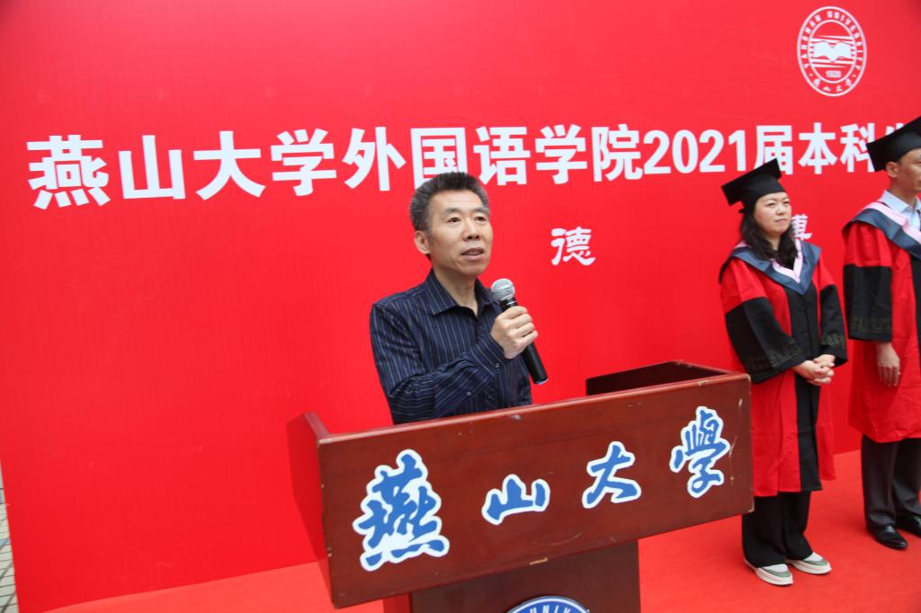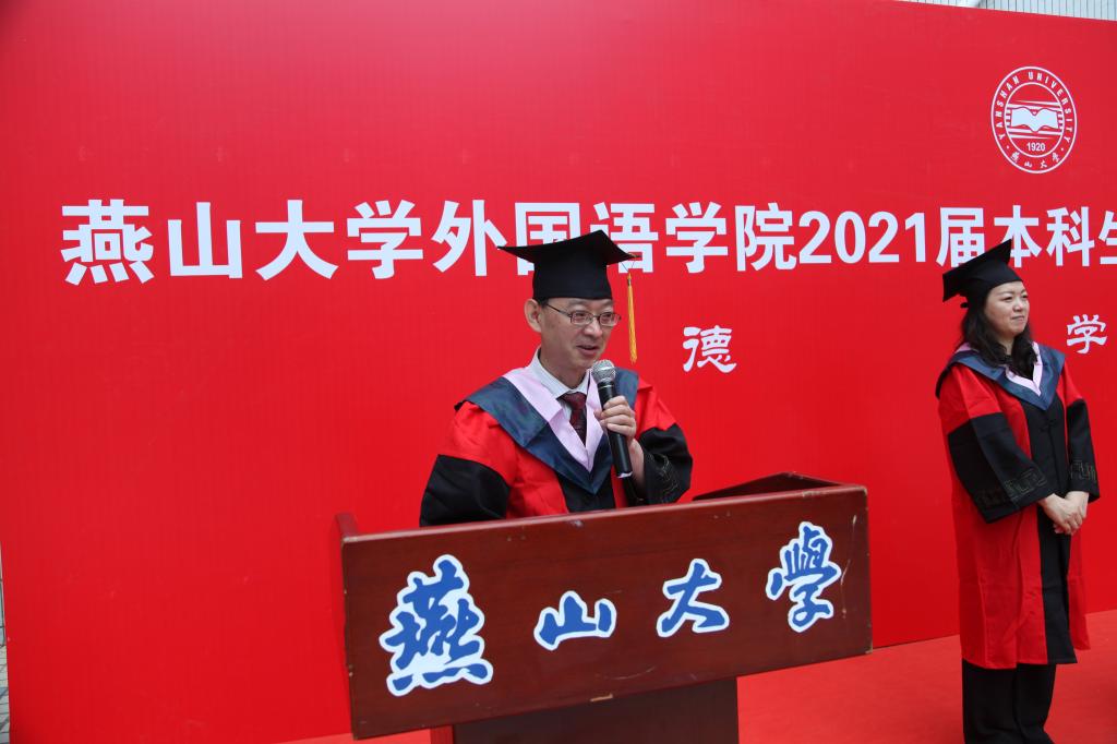 王林海院长在典礼上致辞。他勉励全体毕业生:“勇担时代之责,彰显奋斗之风。练就过硬之能,投身强国伟业。砥砺青云之志,坚定理想信念。”王院长还叮嘱同学们要以今天为新的起点,把自己的志向与理想统一于国家和民族的未来,将小我的人生理想熔铸于中华民族的复兴梦中,读好“无字之书”,在学习中增长知识、锤炼品格,在实践中增长才干、练就本领。未来成为具有国际视野、家国情怀,熟知中外语言与文化的智慧之人。让理想信念在创业奋斗中升华,让青春在创新创造中闪光。
