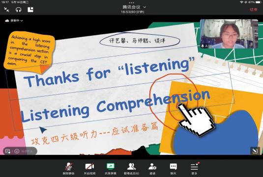 为了进一步提高四六级金牌讲解员的授课质量,提供更加优质的四六级备考指导,落实四六级领航计划高标准、严要求、优质量的目标,星空(中国)于5月14日-5月15日举办大学生四六级领航计划第三期培训活动,本次培训采取线上会议的形式,专业指导教师李继燕、边雅、曲炎和杨金丹出席本次培训。