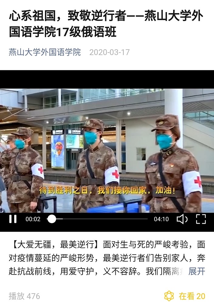 严峻的疫情发生后,作为学生党员,面对“大考”如何抉择?积极响应燕大党支部号召,充分发挥党员的先锋模范作用,毫不犹豫的投入到抗疫队伍中去,用实际行动践行大学生干部党员的使命与担当:踊跃带头为疫情灾区捐款,为疫区人民打赢疫情防控阻击战贡献自己的一份绵薄之力;利用网络动态工具旗帜鲜明的弘扬爱国主义精神,制作具有俄语专业特色的宣传视频;第一时间加入家乡抗疫防疫志愿者行列,到定点居民小区检测出入人员体温、严格做好每家每户外来人员的排查并登记在簿,帮助一方居民筑起牢固的健康防线,以敢为人先的精神展现燕大学子无悔的青春。