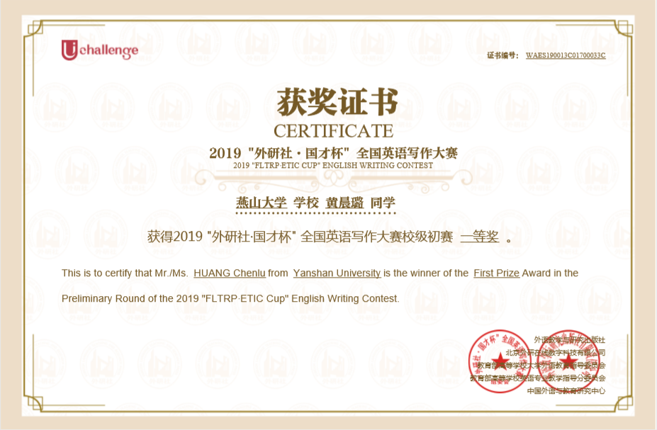 作为一名新时代中国青年,孜孜不倦学习,练就过硬本领已成为时代要求。科学文化知识、专业技能是创新的基石,有感于此,三年来对所学专业,由单纯的感性热爱,到构架本专业知识体系,再到积极探索本专业人才技能需求,提高到理性认识。在学习中寻找最适合自己的学习方法,勤于反思,有意识地制定学习计划。课堂上积极活跃,课下高效完成合作;组织建立学习小组,互相交流学习心得、督促学习,分享学习资料、竞赛信息等,实现与同学共同努力进步。三年来绩点成绩、综测成绩始终是专业前十名。课程学习之余,勇于挑战自己,参与英语能力测试、职业证书考试拿到剑桥商务英语中级证书;备战专业学科竞赛,旨在提高创新能力,获得2019年 "外研社·国才杯" 全国英语写作大赛燕山大学一等奖、阅读大赛燕山大学三等奖;参与集体比赛,所在班级获得2018年燕山大学英语短剧大赛二等奖。