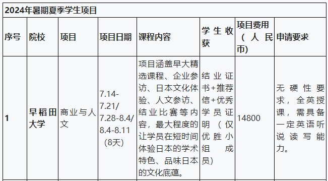 为配合学校“双一流”建设,推进“卓越人才国际化培育工程”,培养更多具有“家国情怀、国际视野和全球竞争力”的国际化人才,2024年暑期学校面向全体在校生开展日本早稻田大学、香港大学、澳门大学等世界名校访学项目并组织报名,具体项目情况如下表所示: