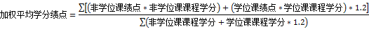 第十二条 学生在校学习总成绩采用加权平均学分绩点进行评定,并记入成绩单。统计加权平均学分绩点时,以主修培养方案内课程的正考成绩绩点进行计算。加权平均学分绩点的计算方法: