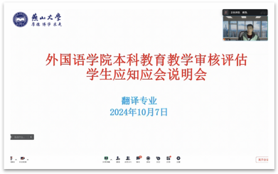 为深入推进我院本科教育教学审核评估准备工作,翻译专业按照学院统一要求于10月7日晚举行“本科教育教学审核评估学生应知应会说明会”,组织专业全体学生集中学习评估手册相关事项和要求,会议由侯羽老师主持。